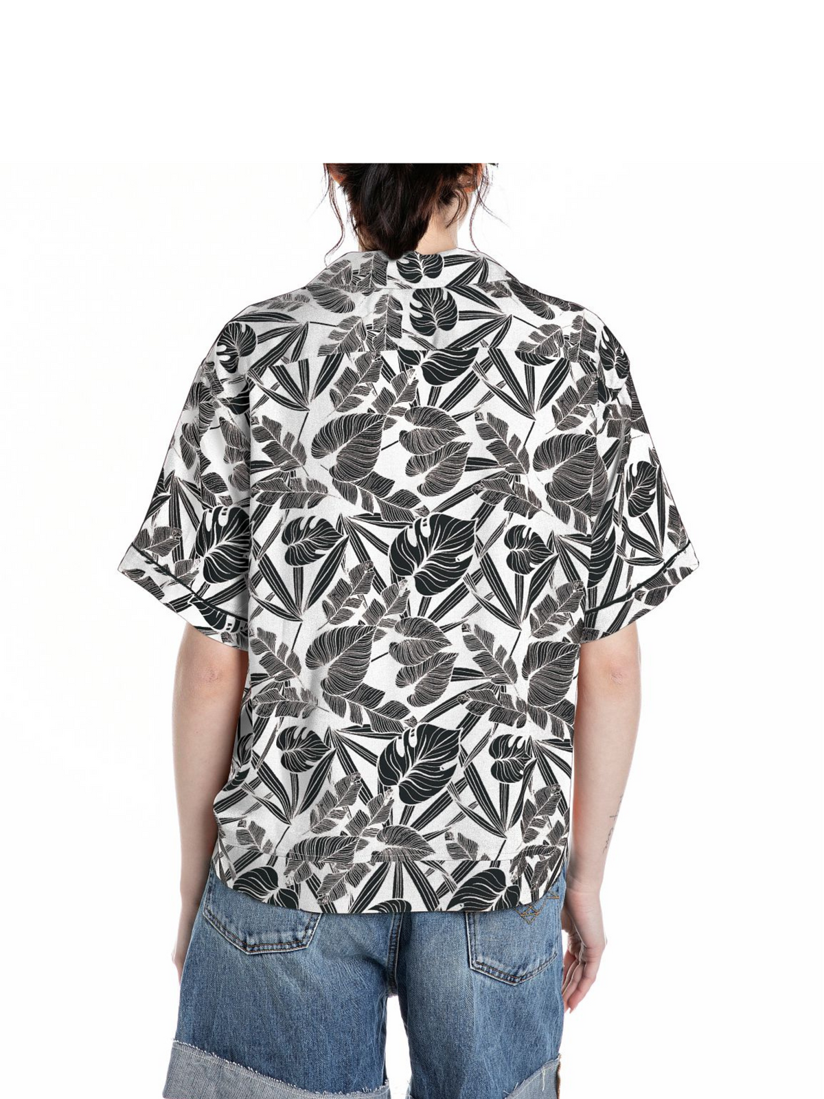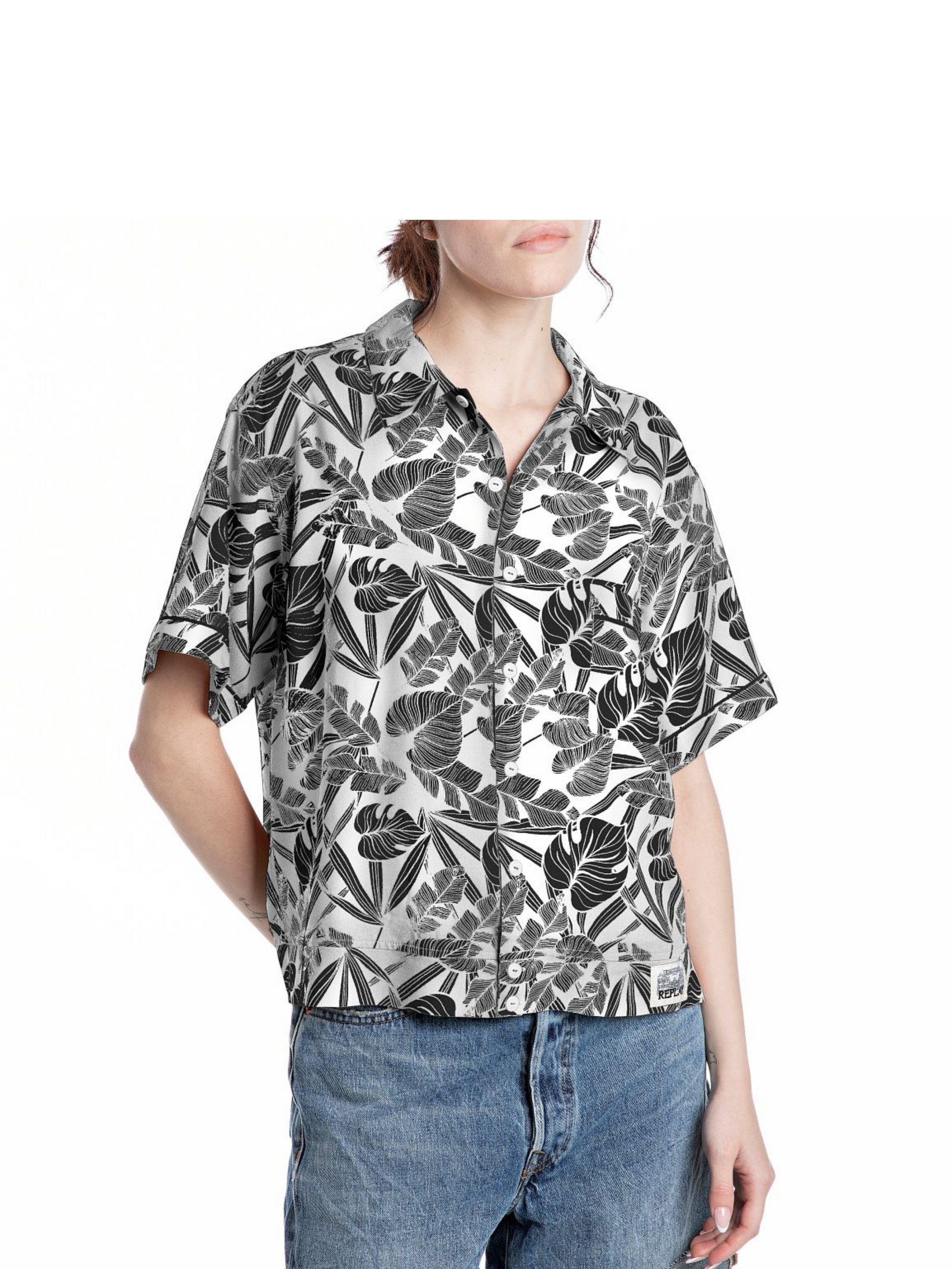Camicia boy fit a manica corta d'ispirazione hawaiana realizzata in morbida viscosa con una stampa a foglie all-over. Il modello sidistingue per il taschino sul petto, le maniche con risvolto e la classica abbottonatura frontale. Completa il design l'etichetta con lettering Replay applicata a fondo capo.